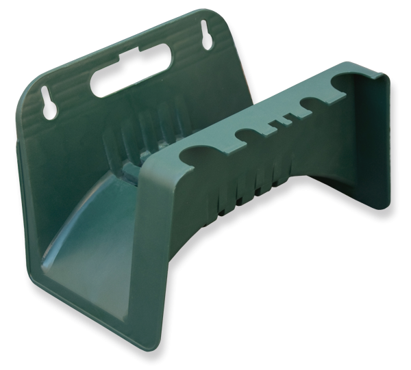 Пластмассовая вешалка для смотанного шланга, крепится на стену. Имеет выемки для крепления поливочного инвентаря.