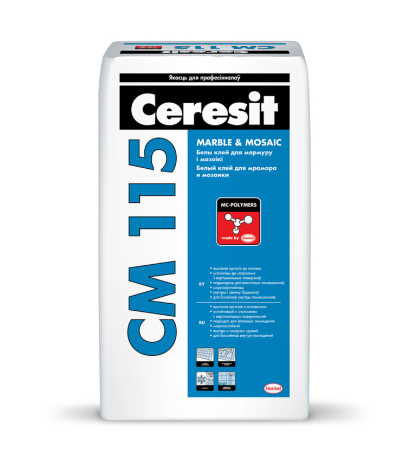 Смесь Ceresit CM 115 предназначена для облицовки бетонных, кирпичных, цементно-песчаных или цементно-известковых поверхностей и других оснований плитами из мрамора и других светлых пород природного камня, а также мозаичными плитками, в т.ч. стеклянными.